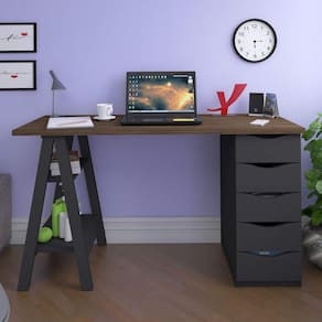 +A+Escrivaninha+Spirit+da+Artany+%E9+ideal+para+sala+de+estar+e+de+estudos.+Possui+5+gavetas+com+corredi%E7as+met%E1licas+e+um+p%E9+em+forma+de+cavalete%2C+garantindo+moderniza%E7%E3o+e+beleza+para+o+seu+espa%E7o.+O+gaveteiro+pode+ser+montado+para+o+lado+direito+ou+esquerdo%2C+se+adequando+ao+ambiente.+O+tampo+%E9+produzido+em+MDP+de+25mm%2C+com+revestimento+em+BP%2C+que+protege+o+m%F3vel+de+poss%EDveis+arranh%F5es. Acabamento: BP Acabamento da Gaveta: BP Acabamento da Prateleira: BP Acabamento dos Pés: BP Altura: 75 cm Altura dos Pés: 50 cm calculo: unidade Complexidade da Montagem: Média: pode ser montado por mais de uma pessoa e/ou necessite de maior conhecimento para montagem Cr: Nogal/Preto Cr Flex: Não Cr Interna: Preto Escala de Brilho: Fosco Escala de Brilho da Gaveta: Brilhante Escala de Brilho da Prateleira: Fosco Estilo: Moderno Formato: Retangular Gaveta com Chave: Não Informações Complementares: Gaveteiro pode ser montado para o lado esquerdo ou direito. Itens Inclusos: 1 Escrivaninha e Manual de Montagem. Largura: 135 cm Linha ou Coleção: Home Office Manual de Montagem e Instalação: https://cdn2.madeiramadeira.com.br/atributo/artany/418921-5657-5658.pdf Material da Gaveta: MDP Material da Prateleira: MDP Material dos Pés: MDP Material Principal: MDP Montagem Flex: Sim Necessita Montagem: Sim Origem do Produto: Nacional Pés Reguláveis: Não Peso: 30 kg Peso Máximo por Gaveta: 2 kg Peso Máximo por Prateleira: 3 kg Possui Gavetas: 05 Possui Passa Cabos: Não Possui Pés: 01 Possui Porta Objetos: Não Possui Portas: Não Possui Prateleiras: 02 Possui Rodízio: Não Possui suporte para CPU: Não Possui Suporte para Teclado: Não Profundidade: 48 cm Recomendações de Uso, Manutenção e Limpeza: Limpar com pano levemente umedecido. Sapatas Niveladoras: Não Sistema de Montagem: Parafuso Minifix, Cavilhas e Parafusos status-cadastro: Aprovado Suporta Até (kg): 20 kg Tamanho: Tipo de Corrediça da Gaveta: Madeira Tipo de Puxador da Gaveta: Embutido