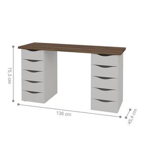 PRODUTO PRECISA DE MONTAGEM?: Sim, a montagem é simples mas sugerimos a contratação do nosso serviço de montagem (para os CEPs em que o serviço está disponível) ou de algum experiente de sua preferência | INSTRUÇÕES/CUIDADOS: Limpar com pano seco e macio, não utilizar produtos abrasivos | FORMATO: Classica | LARGURA PRODUTO COM EMBALAGEM (CM): 159 | QUANTIDADE DE GAVETAS: 10 | ALTURA DO PRODUTO COM EMBALAGEM (CM): 10,5 | CORES DO PRODUTO (FILTRO DE CORES): Nogal/Branco | PESO PRODUTO COM EMBALAGEM (KG): 39 | ESTADO DE ORIGEM: PR | COMPRIMENTO PRODUTO COM EMBALAGEM (CM): 49 | PESO DO PRODUTO (KG): 39 | NOME DO PRODUTO NO FORNECEDOR: Escrivaninha Due | CONTEÚDO DA EMBALAGEM: 1 Escrivaninha | DESCRIÇÃO DO TAMANHO: 75,3x136x45,4 | MATERIAL PARA FILTRO: MDP | MATERIAL PRINCIPAL: MDP | COR PREDOMINANTE: Branco | COMPRIMENTO DO PRODUTO (CM): 45,4 | LARGURA DO PRODUTO (CM): 136 | ALTURA DO PRODUTO (CM): 75,3