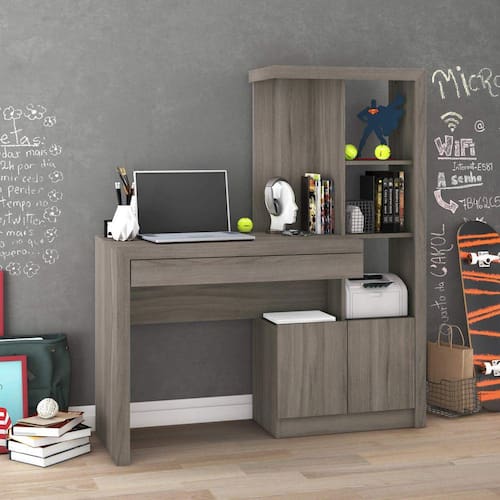 Nada melhor que um quarto organizado, o estudo até rende mais não é mesmo?! Para isso indicamos a Escrivaninha 1 Gaveta 2 Portas 2 Prateleira Tecno Mobili, Estrutura em MDF, Acabamento em BP. Ideal para estudos e organização do quarto. Acabamento da Gaveta: BP Acabamento da Porta: BP Acabamento da Prateleira: BP Acabamento dos Pés: PU Altura dos Pés: 0,3 cm Complexidade da Montagem: Baixa: pode ser montado por uma pessoa sozinha Escala de Brilho: Semi-Fosco Escala de Brilho da Gaveta: Semi-Fosco Escala de Brilho da Porta: Semi-Fosco Escala de Brilho da Prateleira: Semi-Fosco Formato: Retangular Gaveta com Chave: Não Itens Inclusos: 1 Escrivaninha, manual de montagem e kit ferragem. Material da Gaveta: MDP Material da Porta: MDP Material da Prateleira: MDF Material dos Pés: PVC Material Principal: MDP Necessita Montagem: Sim Pés Reguláveis: Não Peso: 32,95 kg Peso Máximo por Gaveta: 3 kg Peso Máximo por Prateleira: 3 kg Possui Passa Cabos: Não Possui Pés: 06 Possui Porta Objetos: Não Possui Portas: 02 Possui Prateleiras: 02 Possui suporte para CPU: Não Possui Suporte para Teclado: Não Quantidade de Nichos: 03 Recomendações de Uso, Manutenção e Limpeza: Utilizar somente pano úmido e sabão neutro. Sapatas Niveladoras: Sim Sistema de Montagem: Parafusos, cavilhas e minifix. Suporta Até (kg): 64 kg Tipo de Corrediça da Gaveta: Metálica Simples Tipo de Dobradiça/Corrediça da Porta: Metálica Tipo de Puxador da Gaveta: Embutido Tipo de Puxador da Porta: Embutido
