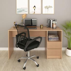 Mesa Para Escritório com Gaveta e Nicho lateral Me4174 possui amplo espaço, material da mesa MDP, acabamento em BP, costas na cor do móvel. A cadeira tem estrutura em poliuretano de altíssima qualidade, que proporciona muito mais resistência, mesmo com o passar dos anos. O acabamento em verniz deixa o móvel mais bonito e dá mais destaque a decoração de toda a casa. Essa cadeira tem design versátil, assento confortável e vem com kit de montagem, para tudo ficar mais rápido e prático. Ela suporta até 120 kg de peso máximo, que dá mais tranquilidade ao sentar e tem 4 pés com rodízios em PU que não arranham o piso do cômodo. Altura do Conjunto: 85 cm Ambiente: null Ambiente Principal: Escritório Cor: Amêndoa/Preto Informação Complementar: 1x Cadeira para Escritório Diretor Tela Mesh Tok 3310 Or Design Preto Largura: 59,5 cm Altura: 85 cm Peso: 8,5 kg Profundidade: 49 cm Necessita Montagem: Sim
