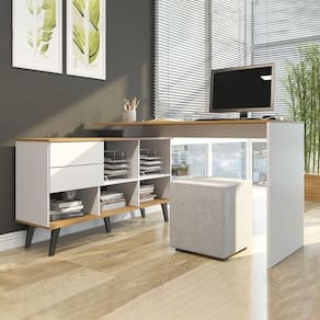 A Mesa Escrivaninha é um móvel útil e versátil que promete ser o protagonista do seu ambiente. Dispõe de um design atual que facilita na hora de montar a decoração, proporcionando um espaço mais aconchegante e organizado. Possui tampo espaçoso, perfeito para o home office, além de estante lateral com duas gavetas e nichos para armazenar seu material de uso diário. O destaque fica por conta dos pés retrô, dando um toque único ao móvel. Além de sua montagem que permite montar a estante nos dois lados, se adequando ao espaço disponível. A mesa é produzida com materiais de excelente qualidade, garantindo a sua durabilidade. O melhor em móveis no design atual aliando conforto, qualidade e ótimos preços, só na Menu Móveis!