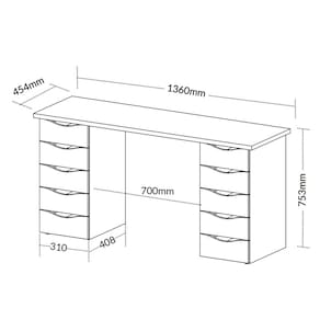 Organize-se para maior produtividade com a Escrivaninha Due, projetada para conciliar elegância, requinte e conforto. Sua forma versátil faz desta mesa perfeita para ser usada em diversos ambientes com estilos diferentes, como em escritório, home office ou quarto, sempre dando um toque especial. 10 amplas gavetas garantem um produto útil e multifuncional, e seu design elegante deixa qualquer ambiente sofisticado e de alto padrão. O espaçoso tampo garante muito conforto e comodidade, para você trabalhar ou estudar com amplo espaço para seu computador, notebook, papéis, livros e outros materiais. O revestimento é feito em BP, proporcionando resistência a impactos, atrito e umidade, certificando uma maior durabilidade ao móvel. O produto perfeito para aumentar o bem estar e a eficiência no trabalho, já que possui o tamanho ideal para maior conforto e produtividade!