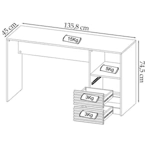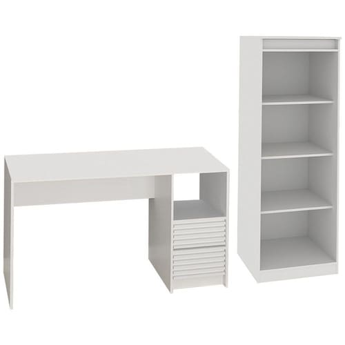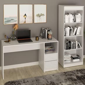 Escrivaninha e Estante Para Escritório ME4174 ME4150, é a opção perfeita para quem busca conforto e funcionalidade em seus momentos de lazer ou home office. Escrivaninha e Estante com estrutura em MDP de 15mm, proporcionando maior durabilidade e resistência, contando com acabamento revestido em BP (Semi - Brilho). Escrivaninha composta por 2 gavetas com detalhe ripado e corrediças telescópicas, 1 prateleira para armazenar itens e acompanha sapatas plásticas. Suportando até 15kg o tampo e 3kg cada gaveta. Estante composta por 4 prateleiras com amplo espaço para armazenar diversos itens. Suportando 4kg cada prateleira. Perfeito para deixar seu ambiente produtivo, belo e organizado, ideal para ser utilizadas em home office, escritório ou um cantinho de estudos. Estes móveis chegarão na sua casa separados em 2 volumes.