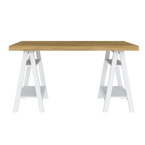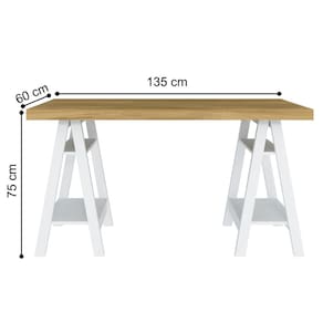 A escrivaninha é feita em MDP, Possui quatro prateleiras para organização de objetos de decoração, livros, cadernos e bloco de notas