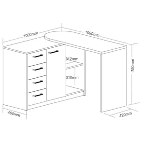 Características da Escrivaninha em L com 4 Gavetas 1 Porta e Nicho London: - Estrutura em MDP 25mm e 15mm de espessura com fita de borda PVC com 0,45mm de espessura; - 4 Gavetas com corrediças metálicas (350mm), medidas internas: 257x335x92mm; - 2 Nichos externos; - Tampo superior giratório formando um L; - 1 Porta com uma prateleira interna e removível, e com ajuste de altura; - Sapatas plásticas; - Não acompanha objetos decorativos; - Montagem por conta do comprador;