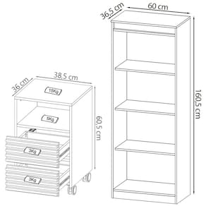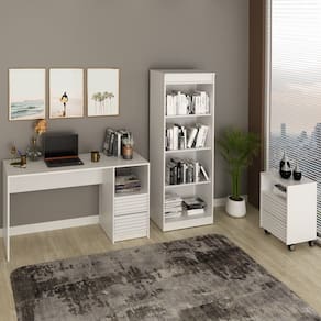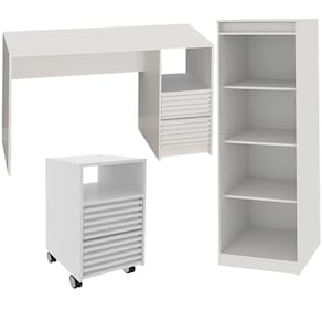 Escrivaninha Estante e Gaveteiro Para Escritório MEX74X50X75, é a opção perfeita para quem busca conforto e funcionalidade em seus momentos de lazer ou home office. Escrivaninha, Estante e Gaveteiro com estrutura em MDP de 15mm, proporcionando maior durabilidade e resistência, contando com acabamento revestido em BP (Semi - Brilho). Escrivaninha composta por 2 gavetas com detalhe ripado e corrediças telescópicas, nicho para armazenar itens e acompanha sapatas plásticas. Suportando até 15kg o tampo e 3kg cada gaveta. Estante composta por 3 prateleiras com amplo espaço para armazenar diversos itens. Suportando 4kg cada prateleira. Gaveteiro composto por 2 gavetas em detalhe ripado com corrediças telescópicas que suportam até 3 kg cada, nicho possibilitando a disposição de decorações e demais objetos e acompanha 4 rodízios. Perfeito para deixar seu ambiente produtivo, belo e organizado, ideal para ser utilizados em home office, escritório ou um cantinho de estudos. Estes móveis chegarão na sua casa separados em 3 volumes.