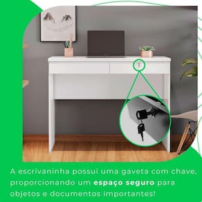 Escrivaninha Felícia Candian Jcm Movelaria Branco Escrivaninha Felicia Candian JCM Movelaria . Movel de qualidade e modernidade, possui 2 gavetas com corredica metalica sendo 1 com chave, puxador em ABS, produto com costa pintada. Caracteristicas do Produto: Marca: JCM Movelaria Modelo: Felicia Material Principal Moveis; MDP Escala da Brilho; Semi-Fosco Possui gaveta: 02 Acabamento da gaveta; Pintura Escala de Brilho da gaveta; Semi-Fosco Material da gaveta; MDP Necessita Montagem; Sim Possui prateleira; nao Marca; JCM Movelaria Ltda Possui Pes; Nao Possui Iluminacao; Nao Peso Maximo por gaveta; 3Kg gaveta com Chave; sim Estilo; Moderno Sapatas Niveladoras; Nao Pes regulaveis: Nao Complexidade da Montagem; media Sistema de Montagem; Parafusos, corredicas. Recomendacoes de Uso, Manutencao e Limpeza; Limpeza com pano macio e levemente umedecido. Nao utilizar solventes a base e de inflamaveis. Nao utilizar produtos abrasivos.