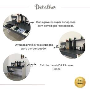 Organize-se para maior produtividade com a Escrivaninha France, projetada para conciliar elegância e conforto. Sua forma versátil faz desta mesa perfeita para ser usada em seu quarto, escritório ou home office, sempre dando um toque especial. As prateleiras ajudam a organizar ainda melhor seu espaço, com decorações, livros e materiais sempre à mão. Além disso, as 2 gavetas abrem e fecham com trilhos telescópicos, o que garante muito mais leveza, facilidade nos movimentos e uma maior abertura, fazendo com que seu espaço seja melhor aproveitado. Ainda, o produto possui sapatas deslizantes para facilitar o transporte sem comprometer o piso. O espaçoso tampo garante muito conforto e comodidade, para você trabalhar ou estudar com amplo espaço para seu computador, notebook, papéis, livros e outros materiais. O produto é feito de MDP e o revestimento é feito em BP, proporcionando resistência a impactos, atrito e umidade, certificando uma maior durabilidade ao móvel. O produto perfeito para aumentar o bem estar e a elegância, já que possui o tamanho e forma ideais para maior conforto e beleza!