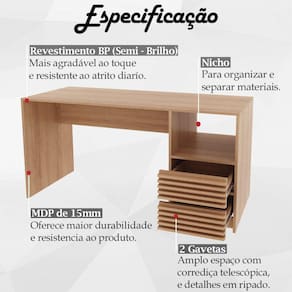 Escrivaninha Gaveteiro Ripado 1 Prateleira ME4174, é a opção perfeita para quem busca conforto e funcionalidade em seus momentos de lazer ou home office. Estrutura em MDP de 15mm , proporcionando maior durabilidade e resistência a peça, contando com acabamento revestido em BP (Semi - Brilho). Composta por 2 gavetas com detalhe ripado e corrediças telescópicas, 1 prateleira para armazenar itens e acompanha sapatas plásticas. Suportando até 15kg o tampo e 3kg cada gaveta. Perfeita para deixar seu ambiente produtivo, belo e organizado, ideal para ser utilizada em home office, escritório ou um cantinho de estudos. Este móvel chegará na sua casa separado em 1 volume.
