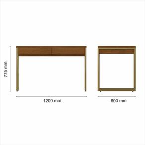 Detalhes Técnicos - Medidas Montadas: A: 77,5cm | C: 120cm | P: 60cm - Material: MDP 15mm/25mm e estrutura em metal - Tampo em MDP de 25mm - Pintura UV - Tonalidade: Dourado/Freijó - 2 Gavetas com Corrediças Metálicas - Cada gaveta suporte até 5kg distribuídos Conteúdo da Embalagem - 01 Escrivaninha - Manual de Montagem - Acessório para Montagem