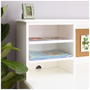 A escrivaninha infantil Guidecraft Taiga Kids Desk and Chair Set with Hutch em branco foi projetada como estação completa de estudo para crianças a partir de 5 anos, combinando tampo amplo, hutch superior com nichos e quadro de cortiça, além de cadeira em madeira coordenada. A mesa oferece dois gavetões com corrediças de madeira e travas de segurança, um nicho aberto sob o tampo para livros ou equipamentos e três nichos no hutch, além de passagem para fiação elétrica na parte traseira para organizar cabos de computador, luminária ou outros dispositivos.?