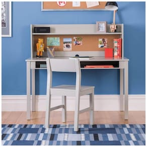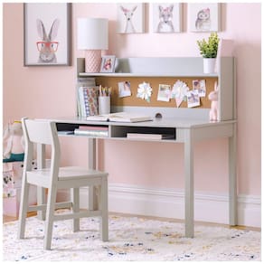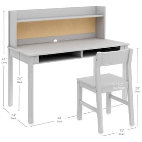 A escrivaninha infantil Martha Stewart Kids’ Desk with Hutch and Chair Set em cinza foi desenvolvida como estação de estudo para crianças, reunindo mesa com tampo amplo, hutch superior com nichos e cadeira coordenada. A estrutura combina madeira de bétula e madeira engenheirada com acabamento de fácil limpeza e cantos arredondados, adequada para uso diário em quartos infantis e áreas de estudo.?