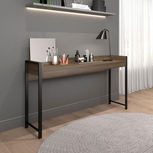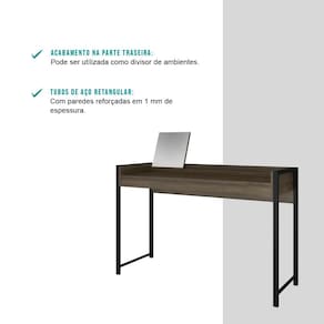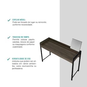 A Escrivaninha Carraro é perfeita para compor diferentes ambientes. Pode ser utilizada como escrivaninha ou como penteadeira, pois conta com espelho móvel que pode ser trocado de lugar conforme a necessidade. Possui também travessa fixada no tampo, ideal para armazenar pequenos objetos como canetas, blocos de papel ou maquiagens. Outro diferencial, é o acabamento traseiroque possibilitaa utilização doproduto como divisor de ambientes.