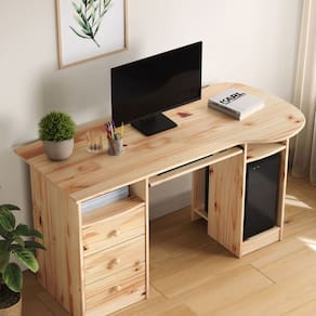 No lado esquerdo, as três gavetas espaçosas com puxadores torneados de madeira no mesmo tom são perfeitas para manter tudo à mão, mas longe da vista. Acima delas, um nicho aberto comporta documentos e itens de uso rápido. No lado direito, o compartimento com duas prateleiras reguláveis oferece flexibilidade para armazenar CPU, livros ou objetos decorativos.