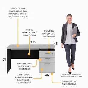 Escrivaninha Mesa Escritório 135cm 3 Gavetas Multimóveis Cr25313 Cinza Preto Transforme seus momentos de trabalho em uma experiência mais produtiva e inspiradora com a Escrivaninha Mesa Escritório 135cm 3 Gavetas Multimóveis CR25313. Com design moderno e estrutura funcional, ela é perfeita para quem busca um ambiente organizado e cheio de estilo. Ideal para o home office ou escritório corporativo, une praticidade, elegância e durabilidade para acompanhar sua rotina com eficiência e bom gosto. Diferenciais: - Produzida em MDP proveniente de reflorestamento: durável e sustentável. - Acabamento em BP: superfície sofisticada e fácil de limpar. - : pode ser montada com o gaveteiro no lado esquerdo ou direito. - Tampo de 30mm: suporta até 25kg para apoiar materiais de trabalho. - 2 gavetas com corrediças metálicas e 1 gaveta para pasta suspensa com corrediças telescópicas. - Fechadura na primeira gaveta: mantém documentos e objetos pessoais em . - Puxadores cromados: oferecem resistência e um visual elegante.