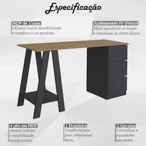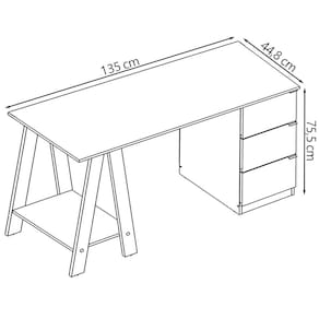 Escrivaninha Mesa Escritório Cavalete 3 Gavetas B62, é um verdadeiro reflexo de eficiência e beleza, ideal para quem busca estilo e funcionalidade. Estrutura produzida em MDP de 15mm, contando com acabamento FF (Fosco), proporcionando maior durabilidade e resistência a peça. Composta por 3 gavetas com puxadores e dobradiças em metal, 1 prateleira com amplo espaço para armazenar itens e 4 pés tipo cavalete com estabilidade excepcional. Suportando até 20kg o tampo, 5kg a prateleira e 5kg cada gaveta. Perfeita para deixar seu ambiente produtivo, belo e organizado, ideal para ser utilizada em home office, escritório ou um cantinho de estudos. Este móvel chegará na sua casa separado em 1 volume.