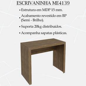 Escrivaninha Mesa Escritorio ME4139, é a opção perfeita para quem busca conforto e funcionalidade em seus momentos de lazer ou home office. Estrutura em MDP de 15mm, proporcionando maior durabilidade e resistência a peça, contando com acabamento revestido em BP (Semi - Brilho). Composta por tampo em MDP, com uma finalização de alto padrão e acompanha sapatas plásticas. Perfeita para deixar seu ambiente produtivo, belo e organizado, ideal para ser utilizada em home office, escritório ou um cantinho de estudos. Este móvel chegará na sua casa separado em 1 volume.