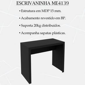 Escrivaninha Mesa Escritorio ME4139, é a opção perfeita para quem busca conforto e funcionalidade em seus momentos de lazer ou home office. Estrutura em MDP de 15mm, proporcionando maior durabilidade e resistência a peça, contando com acabamento revestido em BP (Semi - Brilho). Composta por tampo em MDP, com uma finalização de alto padrão e acompanha sapatas plásticas. Perfeita para deixar seu ambiente produtivo, belo e organizado, ideal para ser utilizada em home office, escritório ou um cantinho de estudos. Este móvel chegará na sua casa separado em 1 volume.