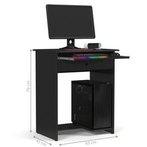 A Mesa para Computador Escrivaninha combina a funcionalidade em um ambiente compacto com o charme do design moderno. Crie um ambiente de trabalho ideal, melhore sua produtividade e não abra mão do conforto. Leve-a para seu home office, escritório e até mesmo no quarto. Dimensões do produto montado: Altura: 79 cm Largura: 65 cm Profundidade: 45 cm Características: - Material MDP - Cor preto - Gaveta - Prateleira - Pés Itens Incluso: 01 Mesa. Kit completo para montagem. Manual de montagem. Observações: - Não nos responsabilizamos pela montagem do produto. - Sistema de Montagem: Parafusos, Cavilhas e Tampos. - É recomendado que a montagem seja feita por um profissional qualificado. - As imagens indicam uma sugestão de uso e são apenas ilustrativas, os objetos decorativos não estão inclusos. - Ao iniciar a montagem, forre o chão com o papelão das embalagens para proteger as peças de arranhões. Instruções e Cuidados: Limpar com pano seco, manter em lugar livre de umidade, ao abrigo de exposição direta ao sol.