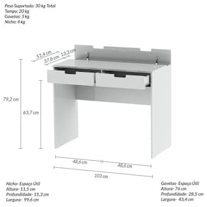 - Cômodo Indicado: Quarto e Escritório - Peso do Produto Montado: 282 - Peso Máximo Suportado: 30 - Medida do Produto Montado (LXCXA): 37,8cmX103cmX79,2cm - Acabamento: Pintura UV - Escala de Brilho: Acetinado - Material da Estrutura: MDP e MDF de 15mm - Produto Necessita de Montagem?: Sim - Quantidade de Gaveta: 2 - Tipo de Gaveta: Com Corrediça Metálica - Quantidade de Pés: 4 - Tipo de Pés: Sapata Oval - Quantidade de Portas: 1 - Tipo de Porta: Basculante - Tipo de Prateleira: Não Possui - Recomendações de manutenção: Pano úmido. Não aplicar lustra móveis. - Volumes: 1 - Garantia: 3 Meses