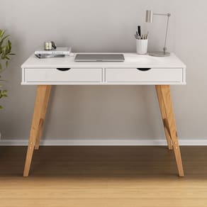 A Escrivaninha Para Quarto Minimalista Nórdica Milo combina design escandinavo e funcionalidade em uma peça compacta e elegante. A Mesa de Trabalho Funcional Home Office Milo possui tampo branco suave e pés em madeira maciça natural, é ideal para home office, estudo ou decoração. Suas duas gavetas espaçosas organizam itens essenciais, enquanto o tamanho otimizado (110x50x75 cm) se adapta a pequenos espaços.Os pés inclinados da Escrivaninha Para Escritório Milo são, inspirados no design escandinavo. Sua angulação suave traz leveza ao visual do móvel, enquanto o formato de cavalete refinado proporciona maior estabilidade e resistência. A Mesa de Escritório Design Escandinavo Moderno Versátil Milo Freijó, possui acabamento minimalista, é perfeita para criar ambientes leves e modernos.