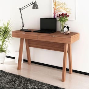 Características da Escrivaninha para Escritório Cavalete 2 Gavetas: - Estrutura em MDP; - Acabamento em BP; - 2 gavetas; - Puxadores em alumínio escovado; - Escrivaninha tipo cavalete; - Suporta até 20kg no tampo e 3kg cada gaveta; - Não acompanha objetos decorativos; - Para uma limpeza mais efetiva, utilizar apenas pano macio umedecido e sabão neutro. Não utilizar produtos abrasivos; - Montagem por conta do comprador;