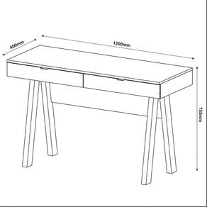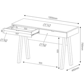 Características da Escrivaninha para Escritório Cavalete 2 Gavetas: - Estrutura em MDP; - Acabamento em BP; - 2 gavetas; - Puxadores em alumínio escovado; - Escrivaninha tipo cavalete; - Suporta até 20kg no tampo e 3kg cada gaveta; - Não acompanha objetos decorativos; - Para uma limpeza mais efetiva, utilizar apenas pano macio umedecido e sabão neutro. Não utilizar produtos abrasivos; - Montagem por conta do comprador;