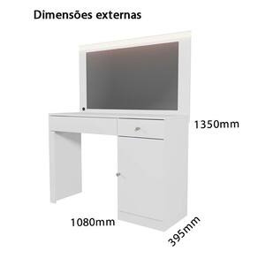 Lindo camarim nina, possui 2 gavetas com corrediças telescópica abre completamente, facilitando o acesso a todo o conteúdo da gaveta sem esforço.sendo 1 gaveta possui com divisor interno que proporciona organização eficiente de maquiagens, bijuterias ou acessórios.), possui também perfil de led(luz branca)que proporciona uma iluminação uniforme e clara, ideal para maquiagem ou cuidados pessoais, espelho de 0,3cm que oferece uma boa área de visualização, ideal para o uso diário, uma porta com puxador para guardar itens maiores ou que não precisam ficar visíveis. Acabamento da Gaveta: Pintura UV Acabamento da Porta: Pintura UV Acabamento da Prateleira: Pintura UV Acompanha Banqueta: Não Altura do Espelho: 50 cm Ambiente Principal: Quarto codigo_ean: 7900288225559 Complexidade da Montagem: Alta: deve ser montado por um montador especializado Cor: Branco Fosco Cor do Produto: Branco Fosco Escala de Brilho: Fosco Escala de Brilho da Gaveta: Fosco Escala de Brilho da Porta: Fosco Escala de Brilho da Prateleira: Fosco Espessura do Espelho: 3 mm Formato do Espelho: Retangular Gaveta com Chave: Não Informações Complementares: POSSUI 2 GAVETAS COM CORREDIÇA TELESCÓPICA(SENDO 1 GAVETA COM DIVISOR INTERNO), PERFIL DE LED(LUZ BRANCA), ESPELHO DE 3mm, 1 PORTA, PUXADORES Itens Inclusos: 1 Penteadeira e Kit Ferragens Largura do Espelho: 90 cm Linha ou Coleção: Nina Manual de Montagem e Instalação: https://product-hub-prd.madeiramadeira.com.br/377941489/documents/d1b8da8a-8a65-4c6c-be28-b7831fd73203318883227781757341149271.pdf Marca: Mobler Material da Gaveta: MDP Material da Porta: MDP Material da Prateleira: MDP Material do Puxador da Gaveta: Plástico Material do Puxador da Porta: Plástico Material Principal: MDP Necessita Montagem: Sim Origem do Produto: Nacional Peso: 29,4 kg Peso Máximo por Gaveta: 1 kg Peso Máximo por Prateleira: 3 kg Possui iluminação: Sim Possui Moldura: Não Possui Pés: Não Possui Porta Objetos: Sim Possui Vidro: Não Quantidade de Espelho: 01 Recomendações de Uso, Manutenção e Limpeza: Para conservar a aparência e a durabilidade do produto utilizar pano macio e úmido, não usar solventes ou abrasivos Sapatas Niveladoras: Não Sistema de Montagem: Pregos, parafusos e cavilhas Suporta Até (kg): 20 kg Tampo Basculante: Não Tipo de Corrediça da Gaveta: Metálica Telescópica Tipo de Dobradiça/Corrediça da Porta: Metálica Tipo de Fixação do Espelho: Silicone Tipo de Lâmpada: FITA DE LED Tipo de Porta: Bater Tipo de Puxador da Gaveta: Externo Tipo de Puxador da Porta: Externo