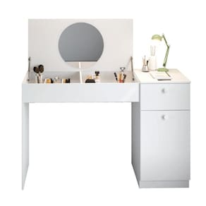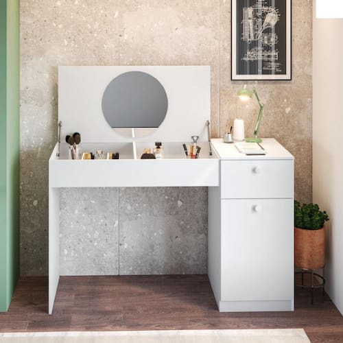 A Penteadeira Monalisa com espelho é ideal para deixar seu dia mais fácil e prático! Desenvolvida especialmente para organizar seus pertences de maquiagem e beleza, possui 1 porta e 1 gaveta com amplo espaço interno e um tampo com pistão a gás que abre seu espelho, se tornando uma ótima bancada para o momento de estudos! Você irá se apaixonar por cada detalhe desse produto.
