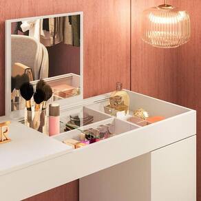 Apresentamos a Penteadeira Love, móvel multifuncional que une escrivaninha e penteadeira. Com camarim com espelho e porta funcional, oferece praticidade e estilo ao quarto.