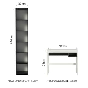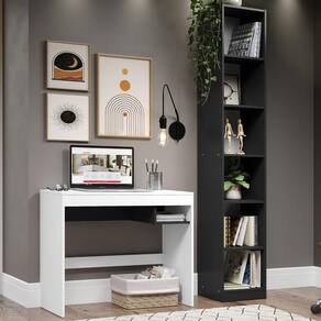 O acabamento da estante é branco e a escrivaninha combina os tons branco e preto. É feito em Pintura Poliéster de alta resistência, método que oferece mais proteção ao móvel e é totalmente ecológico.