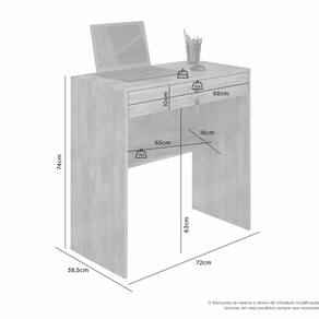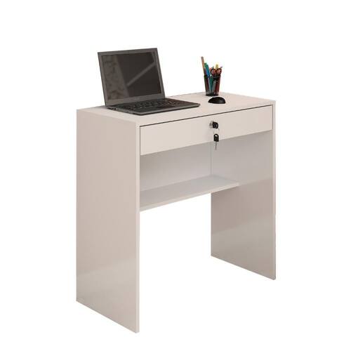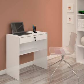 A Escrivaninha Salu é um móvel compacto e funcional, ideal para quartos, home office ou ambientes pequenos. Produzida em MDP 15 mm com acabamento em pintura UV fosca, conta com 1 gaveta com corrediça metálica telescópica e chave, além de 1 prateleira, oferecendo praticidade para organizar objetos do dia a dia. O fundo da gaveta e a costa são em HDF 2,8 mm, garantindo melhor acabamento e resistência.