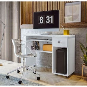 Escrivaninha Vicenza Branco - Lukaliam Móveis A Escrivaninha Vicenza - Lukaliam Móveis possui um design audacioso. Indicada para escritórios modernos, é uma mesa para computador compacta e funcional. Possui gaveta lateral que permite o armazenamento de documentos, prateleira inferior para que você coloque seu estabilizador, suporte para teclado acoplado com corrediças metálicas e ainda tem espaço para o cpu e caixinhas de som. Tudo que o seu escritório precisa, aproveite e leve!Dimensões do Produto Montado:Altura: 80 cmLargura: 98 cmProfundidade: 45 cmObservações:- Fabricado em MDP e MDF;- Puxador termoplástico;- Rodízios;- Suporte para teclado acomplado com corrediças metálicas;- Tampos em MDP de 25mm;- Pintura ultravioleta com acabamento brilho. Marca: Não Informado Ean: 7898571755770
