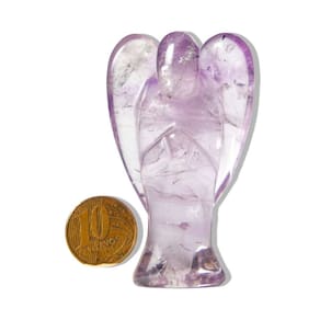 Nome das Pedras: Ametista Cor das Pedras: Roxa, lilás suave Corte das Pedras: Lapidação em formato de anjo Claridade das Pedras: Vitrio cristalizado, realçando sua beleza Medidas das Pedras: Altura de 70 a 90 mm (medidas aproximadas) Peso Total da Rocha: 60 a 100 gramas aproximadamente