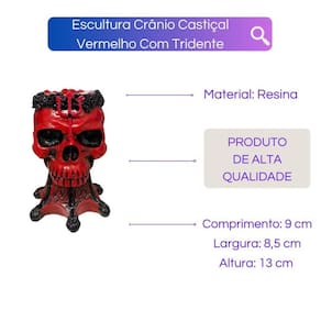 Escultura Crânio Castiçal Vermelho Com Tridente 13 Cm Resina