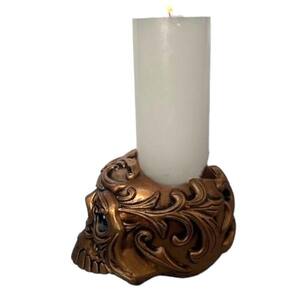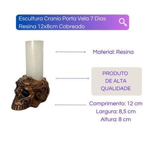 Escultura Crânio Porta Vela 7 Dias Resina 12x8cm Cobreado Crânio Porta Velas, Traz proteção, faça os pedidos coloque no orificio inferior e acenda uma vela no castiçal.
