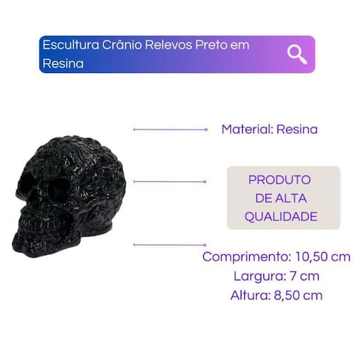 Escultura Crânio Relevos Preto em Resina Escultura Crânio Relevos Preto em Resina A Escultura Crânio Relevos Preto em Resina Bialluz é uma escultura com muito valor espiritual e possui muita fé envolvida. Tem detalhes minuciosos e uma pintura maravilhosa que ressalta toda a escultura. Por ser confeccionada em resina tem alta qualidade e resistência. Carregada de fé e paz, trará ótimas energias para sua vida e dará muita luz no seu caminho Enviamos a sua escultura em até 24 horas após a confirmação de pagamento Dimensões aproximadas: Comprimento: 10,5 cmLargura: 7 cmAltura: 8,5 cmPeso: 650 g Material: Resina Cor: Preto Por ser uma peça feita artesanalmente e pintada à mão podem ocorrer pequenas variações nas cores ou tamanhos. Caso tenha alguma dúvida nos mande mensagem que respondemos rapidinho para te ajudar da melhor forma possível Marca: Meta Atacado