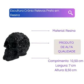 Escultura Crânio Relevos Preto em Resina Escultura Crânio Relevos Preto em Resina
