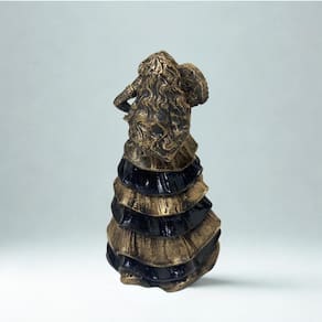 Escultura da Dama da Noite 10 cm, com vestido preto e dourado que exala charme, poder e mistério. Uma representação intensa e refinada da Pomba Gira, senhora dos caminhos, da sensualidade e da liberdade. Feita em resina com acabamento artesanal, é ideal para quem deseja uma peça compacta, mas de forte presença espiritual e estética. Perfeita para altares, ambientes de proteção ou como item simbólico de empoderamento.