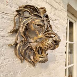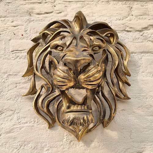 - Conquiste o mundo ou pelo menos suas paredes com a feroz cabeça de leão. Uma bela escultura de cabeça de leão adequada para pendurar na parede. Uma linda peça com um lindo visual metálico e muitos detalhes. Com ouro.