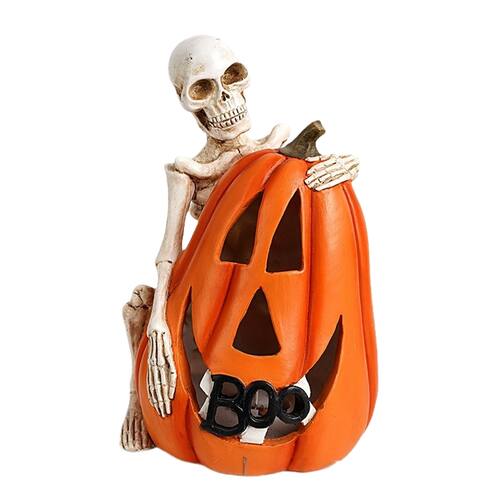 Material: Resina Tamanho: 12,5 cm × 11 cm × 19 cm Peso: 497 g ['Design criativo de Halloween: apresenta um esqueleto sorridente abraçando uma abóbora esculpida com uma placa “BOO”, combinando elementos assustadores e engraçados para decoração festiva. ', 'Material de resina durável: feita de resina premium com detalhes pintados à mão, esta escultura é resistente às intempéries, à prova d'água e perfeita para uso interno e externo. ', 'Tamanho de tela perfeito: mede cerca de 12,5 × 11 × 19 cm e pesa 497 g, o que a torna uma peça robusta e compacta, adequada para exibição de mesa, varanda ou jardim. ', 'Detalhes vívidos feitos à mão: a escultura fina, a textura natural do esqueleto e a cor brilhante da abóbora dão vida à atmosfera de Halloween. ', 'Ornamento sazonal versátil: ideal para configurações de Halloween, vitrines de quintal, entradas residenciais ou como peça central para pátios e gramados.']