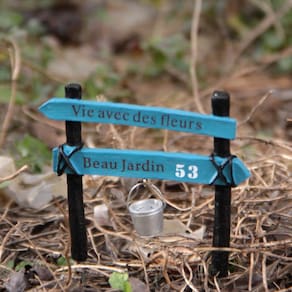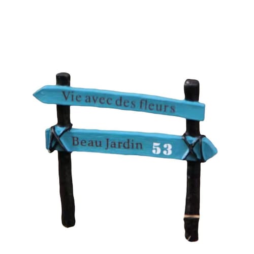 Material: Resina Tamanho: 8,2 × 7,2 cm Peso: 30 g ['Charming French Signpost Design: apresenta uma placa direcional azul com “Vie avec des fleurs” e “Beau Jardin”, adicionando um toque poético a paisagens em miniatura e arranjos de flores. ', 'Artesanato de resina durável: feita de resina resistente, esta pequena escultura oferece resistência às intempéries, adequada para exibições internas ou decorações de jardins externos sem desbotar facilmente. ', 'Figura de paisagem em miniatura: ideal para jardins de fadas, vasos de plantas, terrários ou ornamentos de mesa, realçando qualquer cena com um toque artístico e caprichoso. ', 'Fácil de colocar: compacta e leve, esta miniestátua se encaixa perfeitamente em vasos, jardins de musgo ou decoração de prateleiras, criando uma atmosfera de contar histórias em qualquer canto. ', 'Ornamentos versáteis: perfeitos para configurações criativas, adereços fotográficos, cenas de diorama ou como um detalhe exclusivo entre outros ornamentos e estatuetas de jardim']