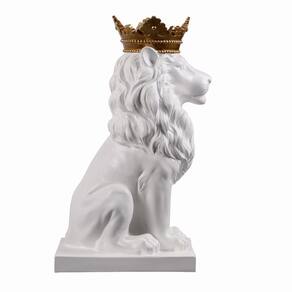 Leão sentado branco de 14,5 polegadas H com coroa dourada, estátua de resina, decoração de casa, tela de sala de estar