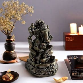 Material: Resina Tamanho: 19 x 14 x 12,4 cm Peso: 310 g Design intrincado de Ganesha — Apresenta a venerada divindade com cabeça de elefante sentada em uma postura de bênção, com touca ornamentada e acessórios detalhados que simbolizam sabedoria e prosperidade. Acabamento em bronze antigo — Acabamento em um tom de bronze vintage que adiciona profundidade, textura e uma estética elegante e envelhecida, adequada para ambientes de decoração tradicionais ou sagrados. Fabricação durável em resina — Feita de resina de alta qualidade, esta estátua é resistente e leve, projetada para suportar exibições internas de longo prazo sem lascar ou desbotar. Figura religiosa simbólica — Representa o removedor de obstáculos e o protetor dos inícios, ideal para melhorar o ambiente espiritual em espaços de meditação, escritórios ou entradas. Display versátil — Medindo 19 x 14 x 12,4 cm, é perfeito para altares, estantes de livros ou desktops, oferecendo um toque cultural significativo e valor artístico de forma compacta.