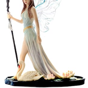 Esta magnífica estátua de elfa caminhando no lago ao lado de um cisne branco é mais do que uma simples escultura - é um símbolo de serenidade e conexão com a natureza, uma obra de arte que fala diretamente à alma.