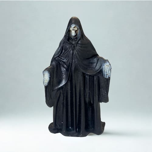 Escultura de Exu Caveira com 10 cm, vestindo imponente capa preta, símbolo de mistério, proteção e domínio sobre os caminhos espirituais. Feita em resina com acabamento artesanal, essa peça traz a força do mensageiro entre os mundos, o guardião das encruzilhadas e da justiça espiritual. Ideal para quem deseja firmeza, quebra de demandas e proteção energética no ambiente. Pequena no tamanho, grande na presença.