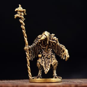 Material: cobre Tamanho: 6 x 4 cm Peso: 40 g Figura de feiticeiro inspirada na fantasia — Retrata um feiticeiro místico de homem-pássaro com vestes e cajado esvoaçantes, combinando elementos de fantasia sombria com expressão artística. Escultura de cobre em miniatura — Feita de cobre sólido com acabamento em latão envelhecido, oferecendo uma estética retrô e uma construção durável em um tamanho compacto de 6x4cm. Design altamente detalhado — apresenta texturas realistas, pés com garras, detalhes em caveira e um bastão retorcido, tornando-o um item de coleção atraente. Enfeite de mesa exclusivo — perfeito para decorar mesas de chá, mesas de estudo ou prateleiras com um toque de mito e imaginação. Decoração de fantasia colecionável — Uma ótima opção para fãs de arte escultórica mística, fantástica ou inspirada em mesa com apelo compacto e portátil.