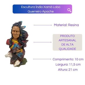 A escultura Índio Xamã Lobo Guerreiro Apache da Bialluz, trará boas energias, bons fluídos e harmonia para sua casa. É ideal para colocar em seu altar ou completar a decoração de seu ambiente. Esculturas são itens especiais e decorativos, é um recurso que dá um toque a mais em qualquer ambiente, tem um valor espiritual e sentimental. Você pode enfeitar com um estilo próprio com muito bom gosto o seu altar ou ambiente. O Índio Xamã com um lobo pode simbolizar a conexão espiritual entre o Xamã e a natureza, representando a orientação espiritual, coragem, lealdade e a busca por transformação e renovação.