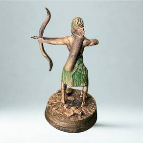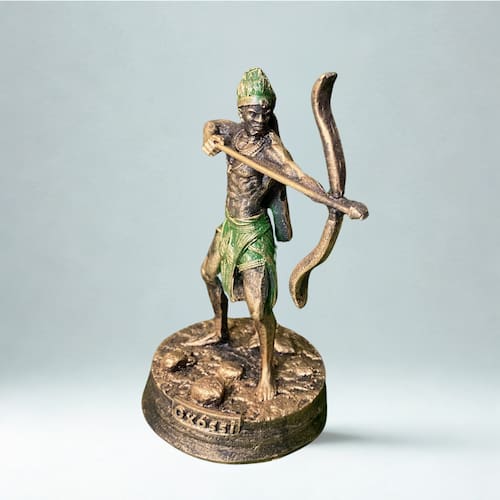 Escultura de Oxóssi com 12 cm de altura, representando o Orixá das matas e da caça com seu tradicional arco e flecha em mãos. Feita em resina com acabamento artesanal, a peça traz riqueza de detalhes e transmite a energia da sabedoria, foco e prosperidade. Ideal para quem busca conexão com a natureza, proteção e força espiritual no ambiente. Compacta e poderosa, perfeita para altar, decoração ou presente com significado.