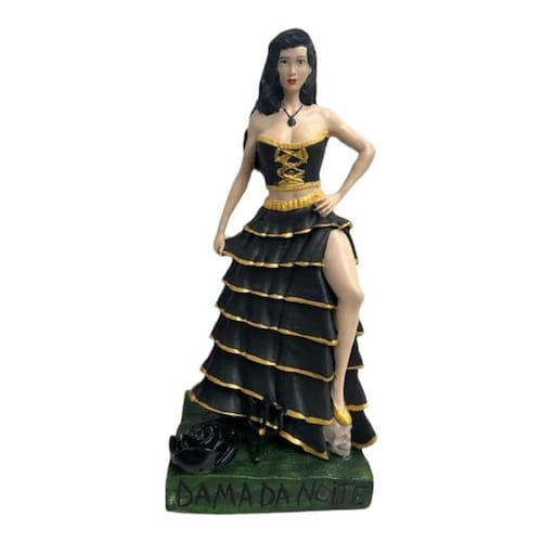 A Escultura Pomba Gira Dama Da Noite Preta, da Bialluz é uma estatueta repleta de detalhes bem feitos e um ótimo item decorativo. Confeccionado em resina garante alta resistência e durabilidade. Possui uma pintura realizada artesanalmente com um brilho incomparável e cores vibrantes.
